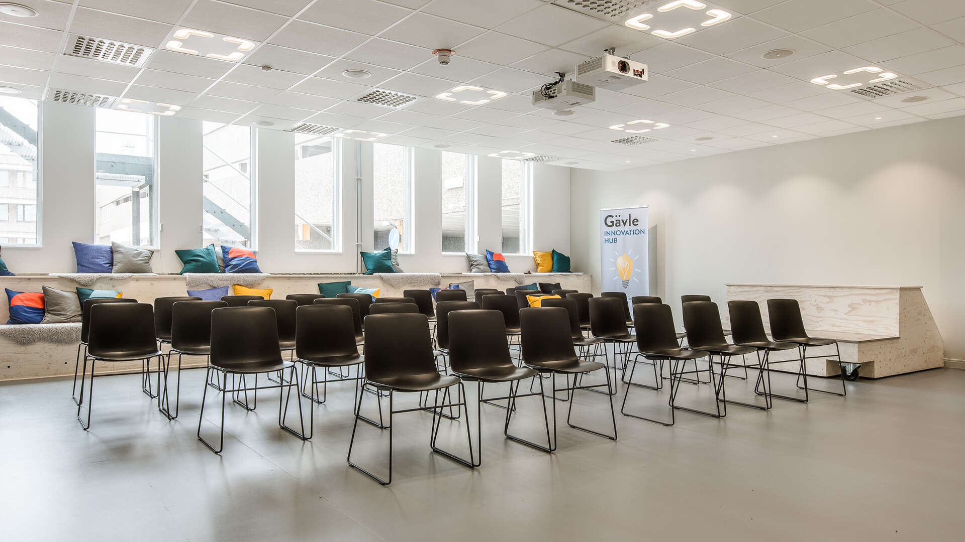 Marshall är vår största lokal med plats för 100 personer i biosittning. Bokas via förfrågan till oss. Lokalen är utrustad med projektorer (2x), ljudsystem och mikrofon.