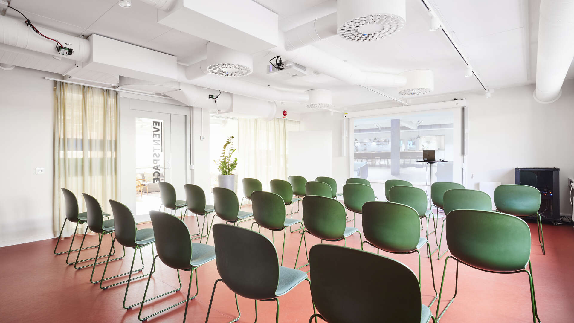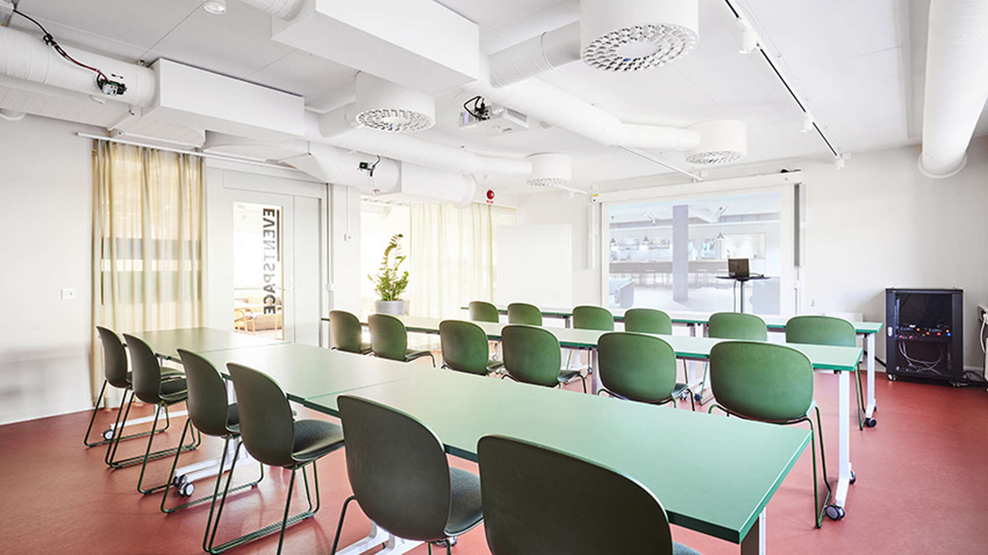 Jacobsen är vår största lokal med plats för 50 personer i biosittning. Bokas via förfrågan till oss. Utrustat med projektor/ duk, ljudsystem och whiteboard. Rummet kan möbleras flexibelt enligt önskemål: