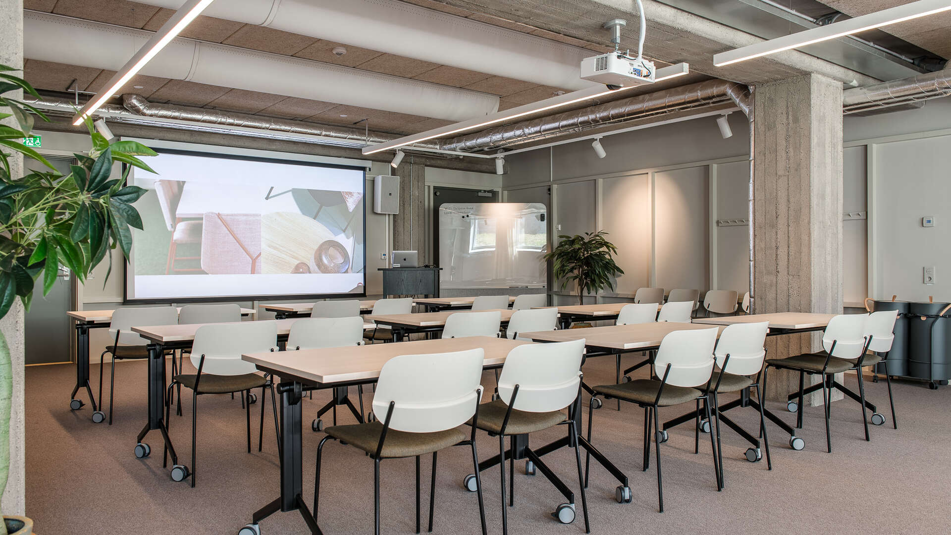 Rummet är utrustat med whiteboard, skärmar och kamera.Rummet kan möbleras enligt:
