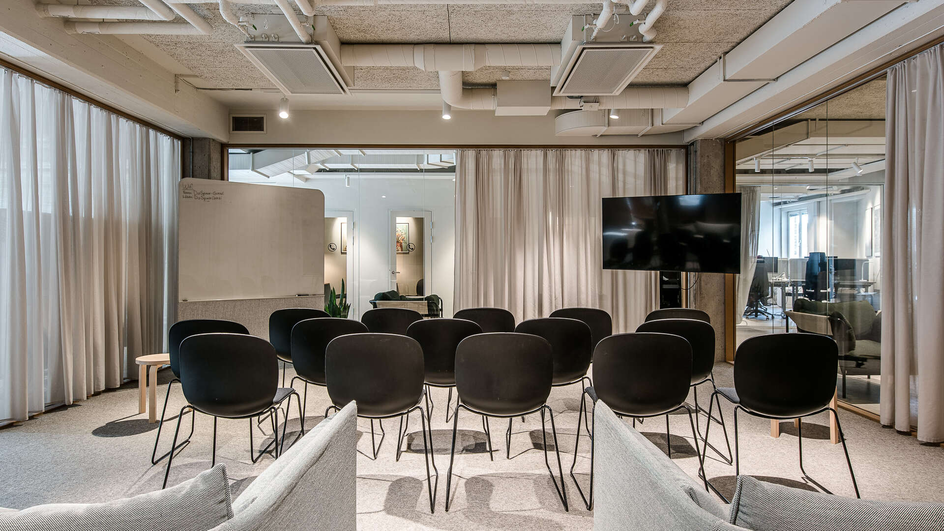 Ferrum bokas via förfrågan till oss. Rummet är utrustat med whiteboard, skärm och kamera. Kan slås ihop med lokal Vitrum och har då plats för 20 personer.