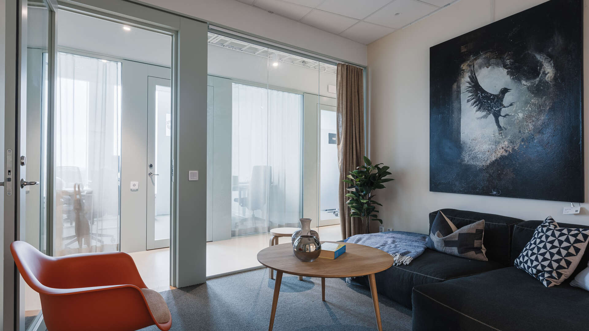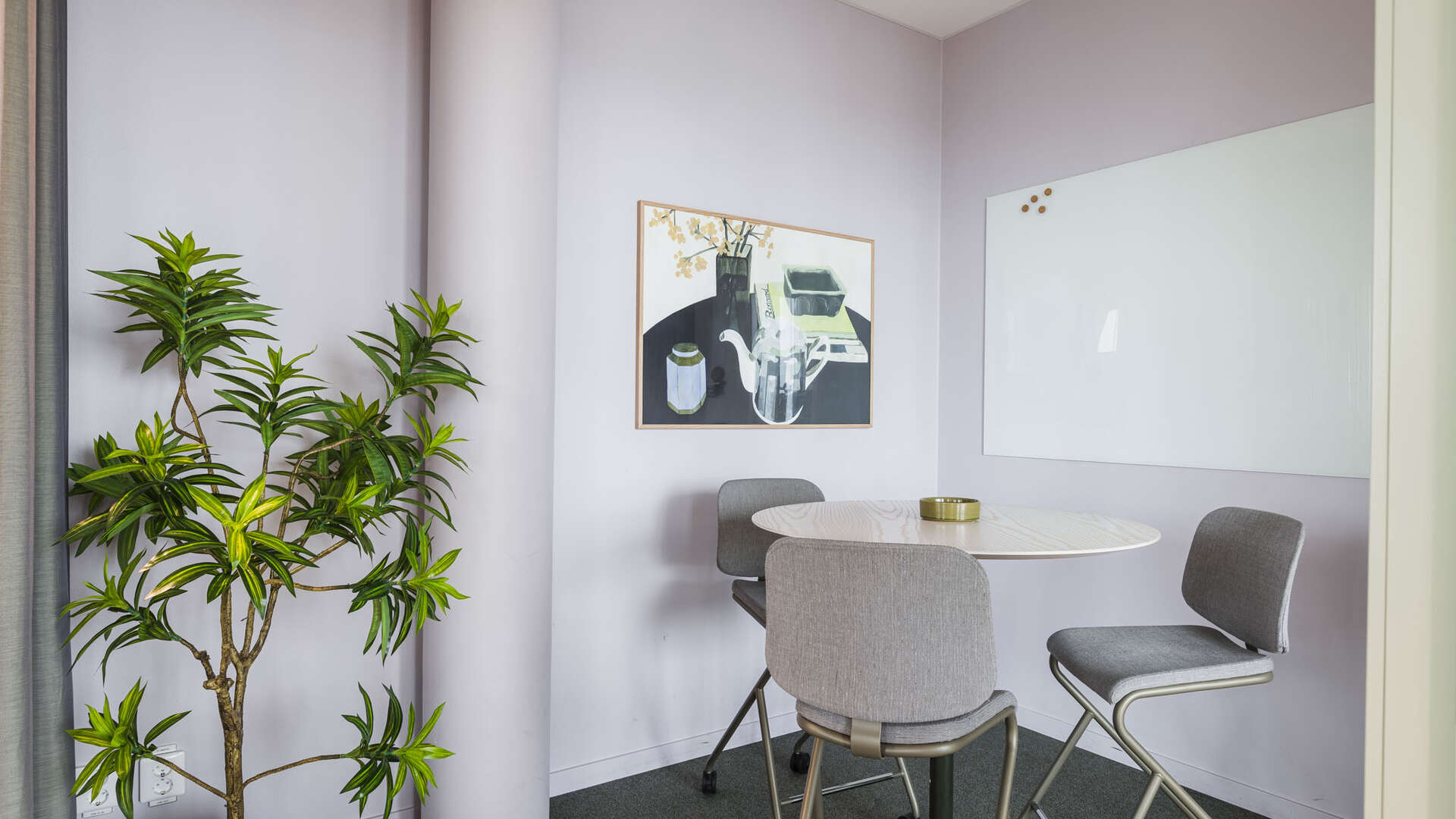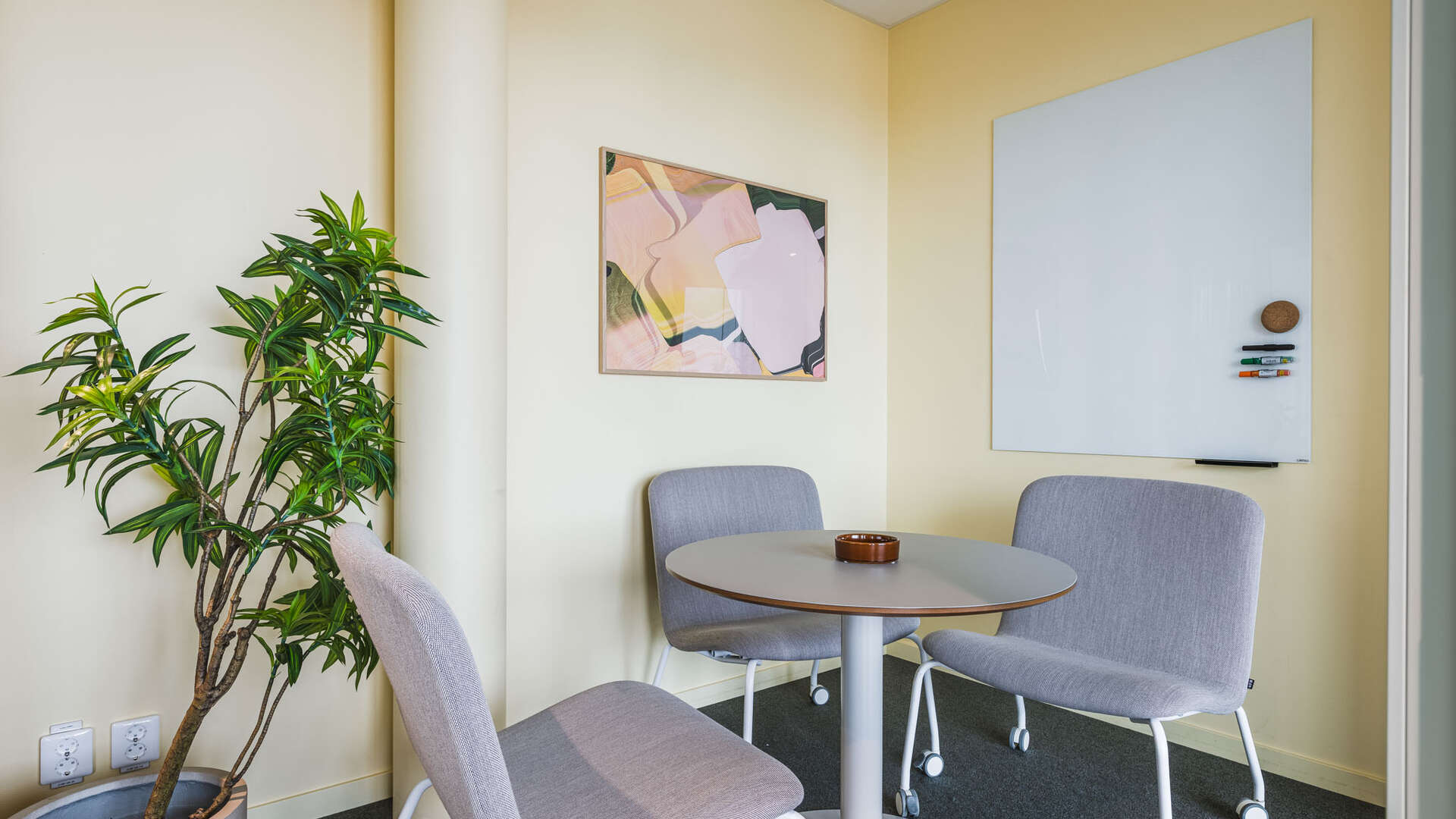 Mindre rum med två fåtöljer, skrivtavla, pennor och magneter.